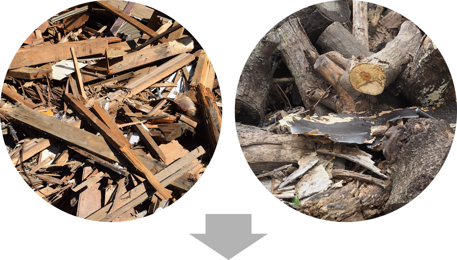 これまでムダに投棄、廃棄されてきた伐根、樹木、解体材などの木くずを